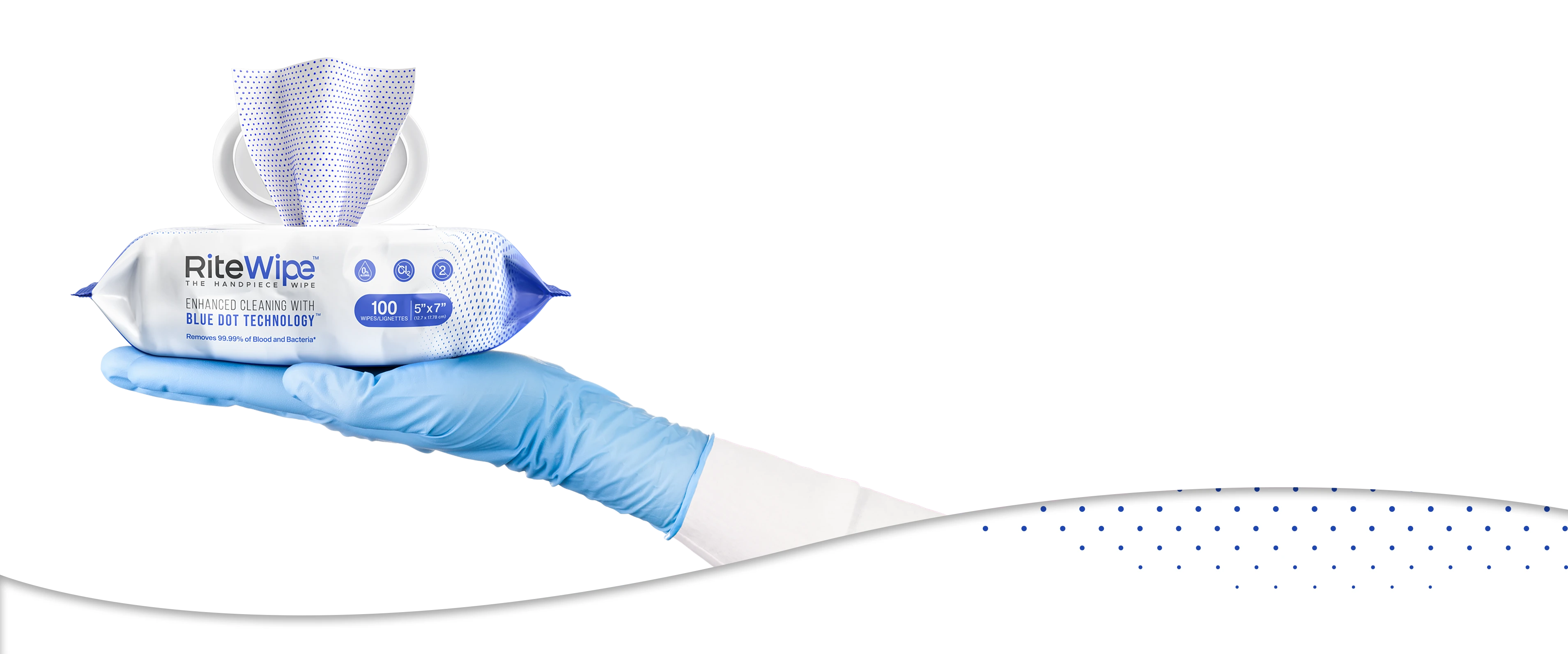 RiteWipe created Blue Dot Technology to deliver a safe and effective dual-action cleaning solution. Precision-engineered blue dots serve as microscrubbers, penetrating deep into handpiece grooves to break up and lift tough bioburden. They work in synergy with our innovative safe surfactant blend, which penetrates and removes stubborn debris—all without the corrosive effects of disinfectants. This pH neutral solution protects the integrity of your handpieces while ensuring thorough cleaning of 99.99% of blood and bacteria. Let RiteWipe do the cleaning, and let your autoclave do the sterilizing.